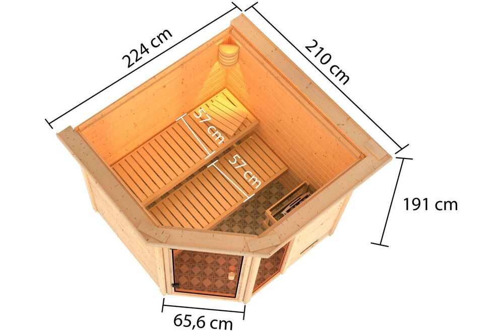Eckeinstieg-Massivholzsauna inklusive zwei Liegen und Ofenschutzgitter