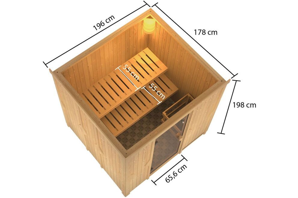 Diese Elementsauna von KARIBU bietet dank ihrer Wandstärke von 68 mm und der im Wandelement eingebauten Mineralwolldämmung eine hervorragende Energieeffizienz. Die vorgefertigten Wandelemente, die außen mit Softline-Profilholz verkleidet sind, sind leichter als Holz und haben gleichzeitig einen höheren Dämmwert. Darüber hinaus sind Saunen mit diesem Wandaufbau günstiger als die Produkte aus Vollholz. Durch die formschöne Saunatür gelangen Sie ins Innere der Kabine. Die Liegen sind ausreichend breit bemessen und bieten Ihnen die nötige Entspannung. Die Elementsaunen haben zwei Sichtseiten und zwei Seiten, welche mit einer Hartfaserplatte ausgestattet sind.