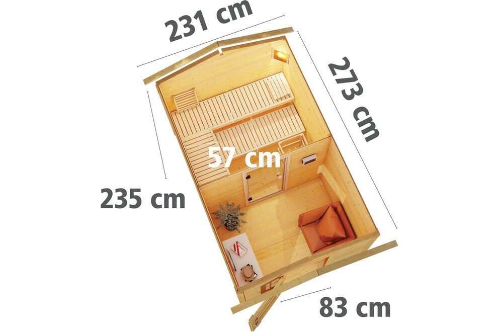 Für die nötige Entspannung sorgen drei komfortable Saunabänke. Auch von außen punktet das Saunahaus mit Qualität und durchdachten Lösungen. Das hochwertige Satteldach aus Massivholz sorgt dafür, dass Sie in der Sauna auch langfristig einen kühlen Kopf bewahren können. Das Thema konstruktiver Holzschutz wird mit einem Dachüberstand von ca. 16 / 28 / 14 cm ausreichend berücksichtigt. So bleiben Türen und Wandbretter optimal geschützt.