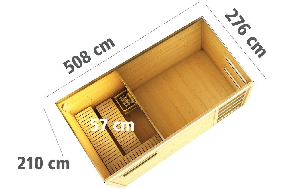 Das absolute Premium-Saunahaus Hygge aus dem Hause KARIBU besteht aus 38 mm starken Bohlen und besticht durch eine besonders hohe Qualität. Mit Hilfe des Steck-Schraub-Systems, ist die Sauna schnell aufgebaut. Das hoch moderne Saunahaus mit Fronteinstieg aus nordischem Fichtenholz bietet Ihnen jede Menge Entspannung im eigenen Garten. In dem großzügigen, integrierten Vorraum können Sie sich bequem umziehen. Wahlweise kann das Modell auch noch durch ein Schleppdach erweitert werden, welches Ihnen weiteren Inspirations- und Gestaltungsspielraum gibt. Die hochwertige Schiebetür mit Dreh-Riegelschloss bietet Ihnen den Eintritt in Ihre Wellnessoase. Saunieren in exklusiver Optik und absoluter Premiumqualität. Schalten Sie den Stress des Alltags aus und machen Sie es sich auf einer der Liegen im Inneren bequem.