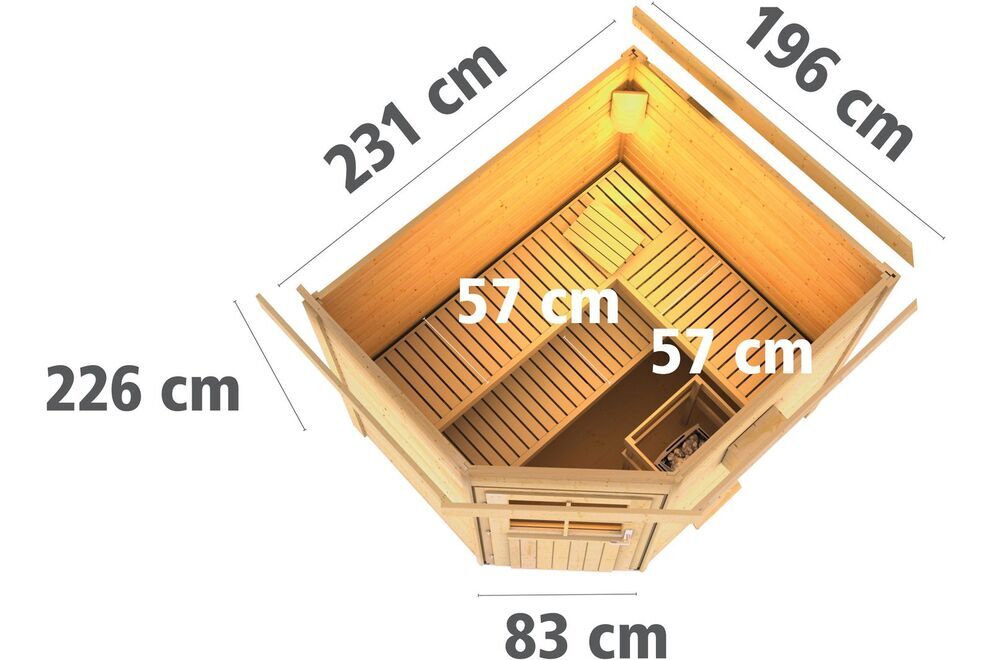 Das Saunahaus Mikka mit Eckeinstieg von KARIBU besteht aus hochwertigen ca. 38 mm dicken Wandbrettern aus Fichtenholz, welches im hohen Norden Europas wächst. Die Montage wird praktischerweise im Steck-/Schraubsystem vorgenommen. Das bedeutet, dass die Wandbretter an senkrechten Eckpfosten montiert werden und somit ein schneller und einfacher Aufbau gewährleistet werden kann. Das Außenmaß von ca. 231 x 196 x 226 cm sorgt für ausreichende Platzverhältnisse bei Ihrem Saunagang. Unterstrichen wird dieses Maß von den Innen-Abmessungen des Saunaraums mit ca. 219 x 184 x 190 cm. Darüber hinaus verfügt das Haus über ein Volumen von ca. 8,9 m³ und eine Grundfläche von ca. 4,36 m².