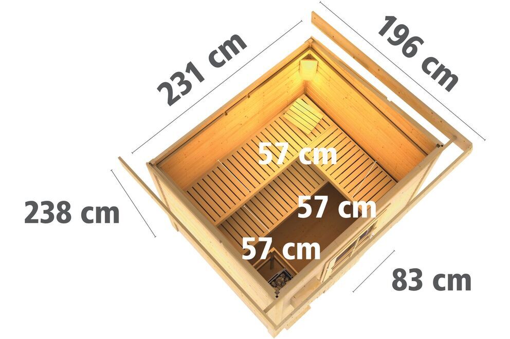 Das Saunahaus Norge mit Fronteinstieg von KARIBU besteht aus hochwertigen ca. 38 mm dicken Wandbrettern aus Fichtenholz, welches im hohen Norden Europas wächst. Die Montage wird praktischerweise im Steck-/Schraubsystem vorgenommen. Das bedeutet, dass die Wandbretter an senkrechten Eckpfosten montiert werden und somit ein schneller und einfacher Aufbau gewährleistet werden kann. Das Außenmaß von ca. 231 x 196 x 238 cm sorgt für ausreichende Platzverhältnisse bei Ihrem Saunagang. Unterstrichen wird dieses Maß von den Innen-Abmessungen des Saunaraums mit ca. 219 x 184 x 190 cm. Darüber hinaus verfügt das Haus über ein Volumen von ca. 9,6 m³ und eine Grundfläche von ca. 4,53 m².