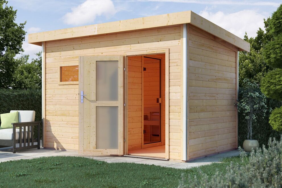 Für die nötige Entspannung sorgen zwei komfortable Saunabänke. Auch von außen punktet das Saunahaus mit Qualität und durchdachten Lösungen. Das hochwertige Pultdach aus Massivholz sorgt dafür, dass Sie in der Sauna auch langfristig einen kühlen Kopf bewahren können. Das Thema konstruktiver Holzschutz wird mit einem Dachüberstand von ca. 20 / 24 / 11 cm ausreichend berücksichtigt. So bleiben Türen und Wandbretter optimal geschützt.