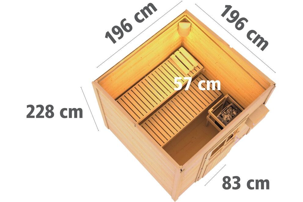 Das Saunahaus Torge mit Fronteinstieg von KARIBU besteht aus hochwertigen ca. 38 mm dicken Wandbrettern aus Fichtenholz, welches im hohen Norden Europas wächst. Die Montage wird praktischerweise im Steck-/Schraubsystem vorgenommen. Das bedeutet, dass die Wandbretter an senkrechten Eckpfosten montiert werden und somit ein schneller und einfacher Aufbau gewährleistet werden kann. Das Außenmaß von ca. 196 x 196 x 228 cm sorgt für ausreichende Platzverhältnisse bei Ihrem Saunagang. Unterstrichen wird dieses Maß von den Innen-Abmessungen des Saunaraums mit ca. 184 x 184 x 190 cm. Darüber hinaus verfügt das Haus über ein Volumen von ca. 7,6 m³ und eine Grundfläche von ca. 3,69 m².