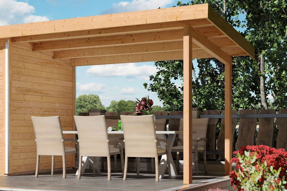 Das passende Schleppdach für Ihre Sauna Skrollan 2 und Skrollan 3 von KARIBU können Sie hier erwerben. Ob nach dem Saunagang Trocken unterstellen oder um den neu gewonnenen Platz für Geräte nutzen, das praktische Schleppdach aus nordischem Fichtenholz macht es möglich.