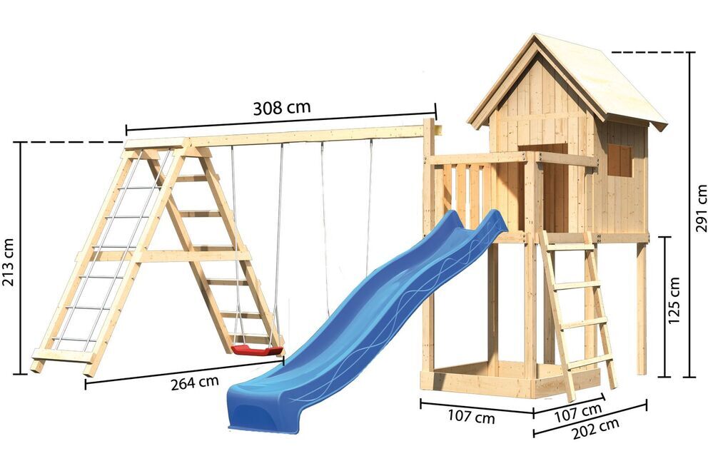 Der attraktive Kinderspielturm Frieda von KARIBU bietet die beste Kombination aus Stelzenhaus und Spielturm. Durch die dreiseitig dicht geschlossene Plattform mit Fensterausschnitten wirkt der Spielturm auf den ersten Blick wie ein Stelzenhaus, hat jedoch die Grundkonstruktion eines Spielturms. Ein weiterer Vorteil des Spielturms ist die Erweitierungsmöglichkeit über das umfangreiche Zubehör mit Anbauplattformen, Rutschen, Schaukelanbauten, Satteldach und Ähnlichem. Hochwertiges naturbelassenes Fichtenholz aus massiven ca. 6,8 x 6,8 cm starken Pfosten sorgt für Standfestigkeit. Die Plattform wird mit Massivholzbrettern zum Schließen der Wände verkleidet. Das selbe Material kommt auch bei Dach und Fußboden zum Einsatz. Hier sind es Massivholzbretter, die für die Stabilität und Sicherheit sorgen und den Turm nach oben mit einem schönen Satteldach abschließen. Dieser Spielturm verfügt in der Basisausstattung bereits eine Holzleiter und einen Sandkasten. Die Leiter kann beliebig am Turm platziert werden. Eine Montageanleitung sowie alle notwendigen Beschläge sind ebenfalls im Lieferumfang enthalten.