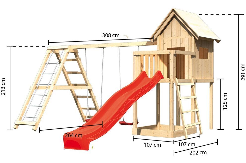 Der attraktive Kinderspielturm Frieda von KARIBU bietet die beste Kombination aus Stelzenhaus und Spielturm. Durch die dreiseitig dicht geschlossene Plattform mit Fensterausschnitten wirkt der Spielturm auf den ersten Blick wie ein Stelzenhaus, hat jedoch die Grundkonstruktion eines Spielturms. Ein weiterer Vorteil des Spielturms ist die Erweitierungsmöglichkeit über das umfangreiche Zubehör mit Anbauplattformen, Rutschen, Schaukelanbauten, Satteldach und Ähnlichem. Hochwertiges naturbelassenes Fichtenholz aus massiven ca. 6,8 x 6,8 cm starken Pfosten sorgt für Standfestigkeit. Die Plattform wird mit Massivholzbrettern zum Schließen der Wände verkleidet. Das selbe Material kommt auch bei Dach und Fußboden zum Einsatz. Hier sind es Massivholzbretter, die für die Stabilität und Sicherheit sorgen und den Turm nach oben mit einem schönen Satteldach abschließen. Dieser Spielturm verfügt in der Basisausstattung bereits eine Holzleiter und einen Sandkasten. Die Leiter kann beliebig am Turm platziert werden. Eine Montageanleitung sowie alle notwendigen Beschläge sind ebenfalls im Lieferumfang enthalten.