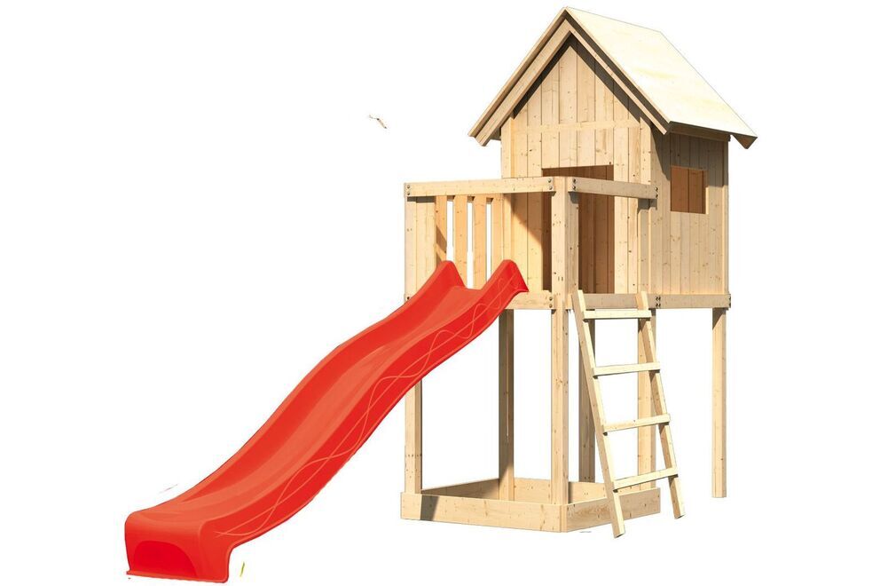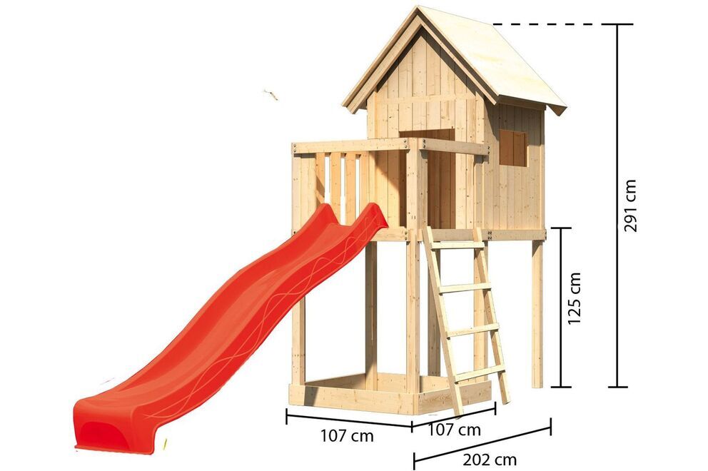 Der attraktive Kinderspielturm Frieda von KARIBU bietet die beste Kombination aus Stelzenhaus und Spielturm. Durch die dreiseitig dicht geschlossene Plattform mit Fensterausschnitten wirkt der Spielturm auf den ersten Blick wie ein Stelzenhaus, hat jedoch die Grundkonstruktion eines Spielturms. Ein weiterer Vorteil des Spielturms ist die Erweitierungsmöglichkeit über das umfangreiche Zubehör mit Anbauplattformen, Rutschen, Schaukelanbauten, Satteldach und Ähnlichem. Hochwertiges naturbelassenes Fichtenholz aus massiven ca. 6,8 x 6,8 cm starken Pfosten sorgt für Standfestigkeit. Die Plattform wird mit Massivholzbrettern zum Schließen der Wände verkleidet. Das selbe Material kommt auch bei Dach und Fußboden zum Einsatz. Hier sind es Massivholzbretter, die für die Stabilität und Sicherheit sorgen und den Turm nach oben mit einem schönen Satteldach abschließen. Dieser Spielturm verfügt in der Basisausstattung bereits eine Holzleiter und einen Sandkasten. Die Leiter kann beliebig am Turm platziert werden. Eine Montageanleitung sowie alle notwendigen Beschläge sind ebenfalls im Lieferumfang enthalten.