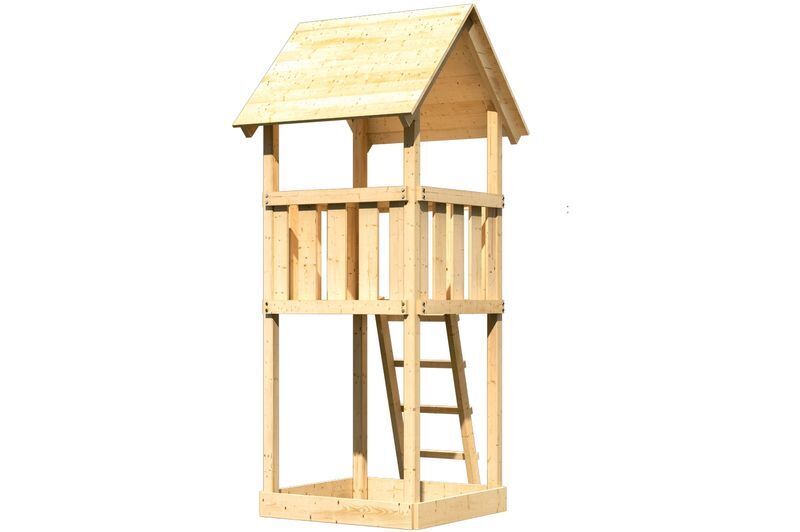 Der Spielturm Lotti von KARIBU ist die ideale Wahl für alle kleinen Abenteurer und Abenteurerinnen, die hoch hinaus wollen. Bestes naturbelassenes nordisches Fichtenholz mit einer Grundkonstruktion aus ca. 6,8 x 6,8 cm starken Pfosten. Das Holz kommt aus dem hohen Norden Europas und ist absolut unbehandelt. Dadurch ist es frei von allen bekannten problematischen Substanzen, die bei Kesseldruckimprägnierungen in das Holz eindringen könnten. Die Podesthöhe von ca. 125 cm bietet beste Ausblicke und bringt die Phantasie Ihres Kindes zum Blühen. Das Satteldach und die Brüstungsbretter sind aus ca. 18 mm starken Brettern gerfertigt und bieten hohe Stabilität und somit langlebige Sicherheit. Der Spielturm hat bereits im Standard-Lieferumfang einen Sandkasten und eine robuste Holzleiter mit 4 Sprossen. Natürlich hat der Spielturm Lotti ein Zertifikat vom TÜV-Nord für geprüfte Sicherheit (GS) nach DIN EN 71-1, DIN EN 71-3, DIN EN 71-8 und AfPS GS 2014. Alle benötigten Schrauben und Nägel, ausgenommen die Befestigungen im Boden, sind im Lieferumfang ebenso enthalten.