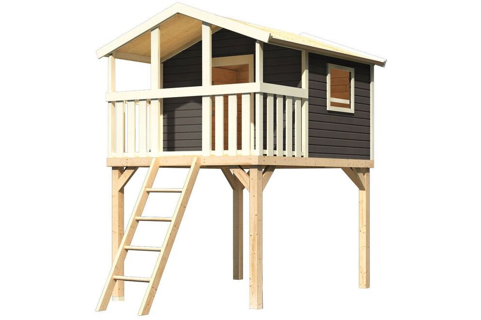 Das riesige Stelzenhaus Benjamin von KARIBU in wahlweise terragrau, seidengrau oder naturbelassen und überzeugt mit extrem hoher Stabilität. Die Grundkonstruktion aus ca. 9 x 9 cm starken Massivholzpfosten ist für eine höhere Witterungresistenz kesseldruckimprägniert und bestehen aus Fichtenholz. Die ca. 19 mm dicken Wandbretter und das Dach sowie die Fußbodenbretter sind ebenfalls aus Holz hergestellt. Die Wandbretter werden im einfachen Steck/-Schraubsystem montiert, sodass schnell der neue Traum Ihrer Kinder im eigenen Garten steht. Das Außenmaß des Hauses ist misst ca. 198 x 244 cm. Die über die gesamte Front reichende Terrasse ist auf der Längsseite mit einem Brüstungselement, ebenfalls aus nordischer Fichte, versehen und bietet so ausreichenden Schutz. Die Podesthöhe von ca. 150 cm eignet sich ideal für etwas ältere Kinder. Die Tür- und Fensteröffnungen sind aus Sicherheitsgründen nicht verschlossen. Auch das Haus Benjamin hat ein Zertifikat vom TÜV-Nord für geprüfte Sicherheit (GS) nach DIN EN 71-1, DIN EN 71-3, DIN EN 71-8 und AfPS GS 2014. Alle benötigten Schrauben und Nägel, ausgenommen die Befestigungen im Boden, sind im Lieferumfang ebenfalls enthalten.