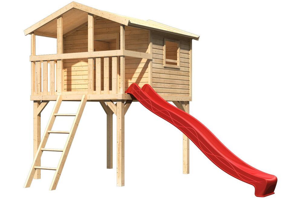 Das riesige Stelzenhaus Benjamin von KARIBU in wahlweise terragrau, seidengrau oder naturbelassen und überzeugt mit extrem hoher Stabilität. Die Grundkonstruktion aus ca. 9 x 9 cm starken Massivholzpfosten ist für eine höhere Witterungresistenz kesseldruckimprägniert und bestehen aus Fichtenholz. Die ca. 19 mm dicken Wandbretter und das Dach sowie die Fußbodenbretter sind ebenfalls aus Holz hergestellt. Die Wandbretter werden im einfachen Steck/-Schraubsystem montiert, sodass schnell der neue Traum Ihrer Kinder im eigenen Garten steht. Das Außenmaß des Hauses ist misst ca. 198 x 244 cm. Die über die gesamte Front reichende Terrasse ist auf der Längsseite mit einem Brüstungselement, ebenfalls aus nordischer Fichte, versehen und bietet so ausreichenden Schutz. Die Podesthöhe von ca. 150 cm eignet sich ideal für etwas ältere Kinder. Die Tür- und Fensteröffnungen sind aus Sicherheitsgründen nicht verschlossen. Auch das Haus Benjamin hat ein Zertifikat vom TÜV-Nord für geprüfte Sicherheit (GS) nach DIN EN 71-1, DIN EN 71-3, DIN EN 71-8 und AfPS GS 2014. Alle benötigten Schrauben und Nägel, ausgenommen die Befestigungen im Boden, sind im Lieferumfang ebenfalls enthalten.