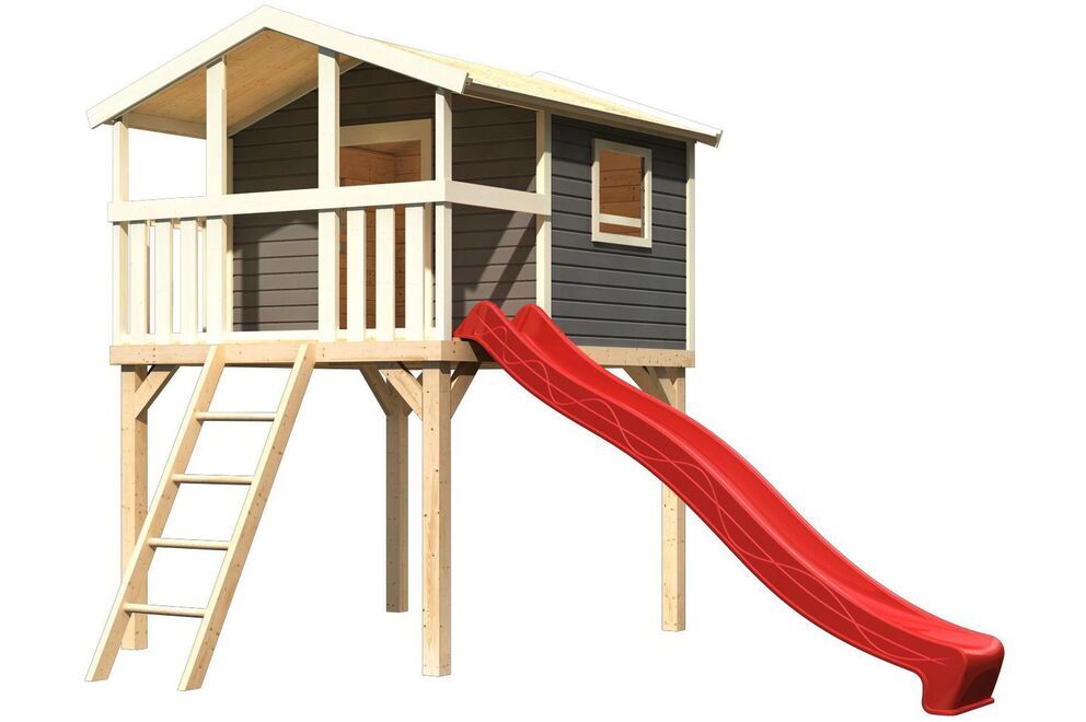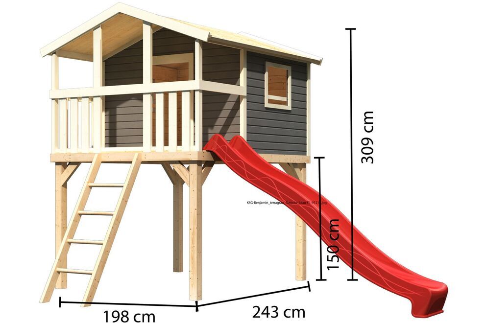 Das riesige Stelzenhaus Benjamin von KARIBU in wahlweise terragrau, seidengrau oder naturbelassen und überzeugt mit extrem hoher Stabilität. Die Grundkonstruktion aus ca. 9 x 9 cm starken Massivholzpfosten ist für eine höhere Witterungresistenz kesseldruckimprägniert und bestehen aus Fichtenholz. Die ca. 19 mm dicken Wandbretter und das Dach sowie die Fußbodenbretter sind ebenfalls aus Holz hergestellt. Die Wandbretter werden im einfachen Steck/-Schraubsystem montiert, sodass schnell der neue Traum Ihrer Kinder im eigenen Garten steht. Das Außenmaß des Hauses ist misst ca. 198 x 244 cm. Die über die gesamte Front reichende Terrasse ist auf der Längsseite mit einem Brüstungselement, ebenfalls aus nordischer Fichte, versehen und bietet so ausreichenden Schutz. Die Podesthöhe von ca. 150 cm eignet sich ideal für etwas ältere Kinder. Die Tür- und Fensteröffnungen sind aus Sicherheitsgründen nicht verschlossen. Auch das Haus Benjamin hat ein Zertifikat vom TÜV-Nord für geprüfte Sicherheit (GS) nach DIN EN 71-1, DIN EN 71-3, DIN EN 71-8 und AfPS GS 2014. Alle benötigten Schrauben und Nägel, ausgenommen die Befestigungen im Boden, sind im Lieferumfang ebenfalls enthalten.