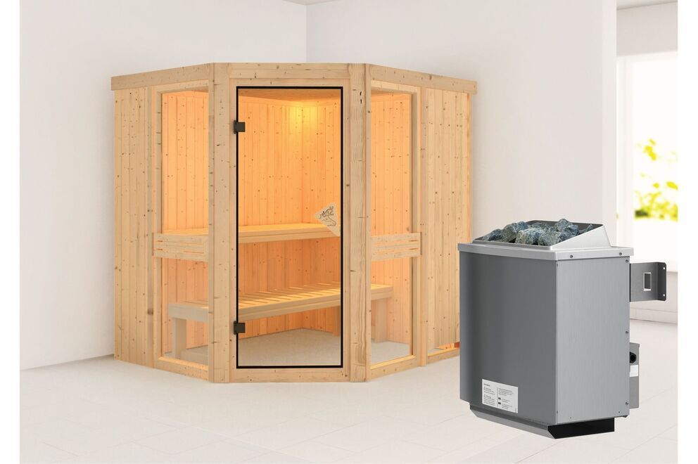 Außen befindet sich dann eine stabile Hartfaserplatte. Die Sauna verfügt über einen formschönen und praktischen Eckeinstieg. Mit ihren Außenmaßen von ca. 196 x 170 x 198 cm (mit Kranz ca. 210 x 184 x 202 cm) und den daraus resultierenden Innenmaßen von ca. 181 x 155 x 192 cm bietet diese Sauna für alle Anforderungen ausreichend Platz. Die zwei Liegen werden innen auf Vierkanthölzern montiert, welche aufgrund der Systembauweise in der Höhe nicht flexibel sind. Die untere Liege kann jedoch bei Bedarf platzsparend unter die obere Bank geschoben werden, sodass der Innenraum größer wirkt und sich die Reinigung einfacher gestaltet. Ein Ofenschutzgitter ist stets im Lieferumfang enthalten, ebenso wie zwei Bänke und eine Kopfstütze, die das Interieur gekonnt abrunden.