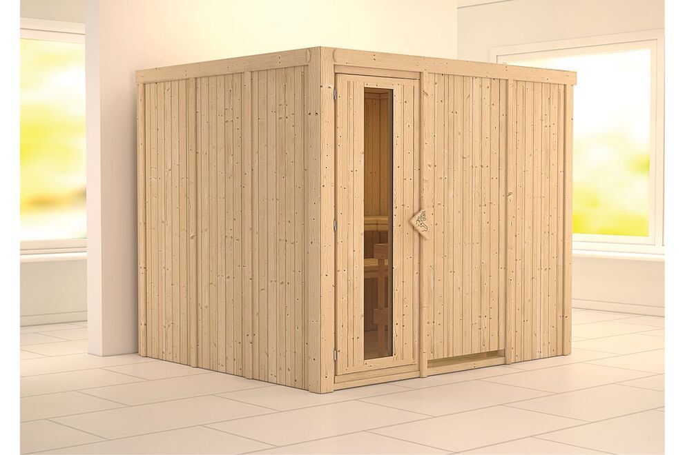Außen befindet sich dann eine stabile Hartfaserplatte. Die Sauna verfügt über einen formschönen und praktischen Fronteinstieg. Mit ihren Außenmaßen von ca. 231 x 196 x 198 cm (mit Kranz ca. 245 x 210 x 202 cm) und den daraus resultierenden Innenmaßen von ca. 216 x 181 x 192 cm bietet diese Sauna für alle Anforderungen ausreichend Platz. Die zwei Liegen werden innen auf Vierkanthölzern montiert, welche aufgrund der Systembauweise in der Höhe nicht flexibel sind. Die untere Liege kann jedoch bei Bedarf platzsparend unter die obere Bank geschoben werden, sodass der Innenraum größer wirkt und sich die Reinigung einfacher gestaltet. Ein Ofenschutzgitter ist stets im Lieferumfang enthalten, ebenso wie drei Bänke und eine Kopfstütze, die das Interieur gekonnt abrunden.