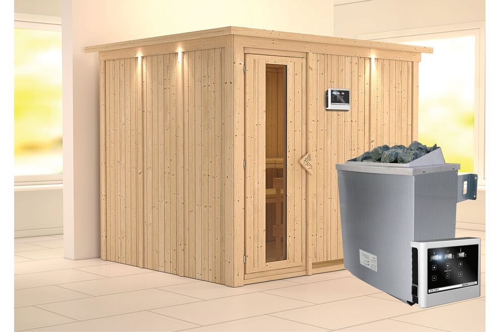 Dieses Modell ist in vielen unterschiedlichen Ausführungen erhältlich, sodass Sie sich Ihre Wunschsauna individuell zusammenstellen können. Ob mit oder ohne Kranz, ob externe oder interne Steuerung, ob Standard- oder Biokombiofen - die verfügbaren Extras könnten umfangreicher nicht sein. Sehen Sie sich außerdem auch das zahlreiche Sauna-Zubehör in der entsprechenden Rubrik an.
