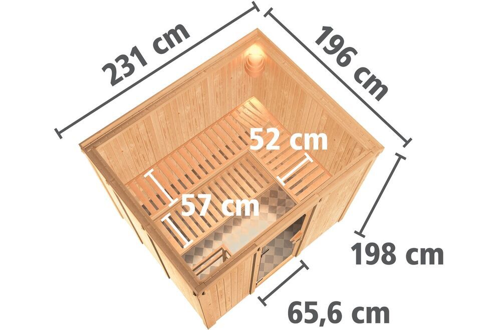 Außen befindet sich dann eine stabile Hartfaserplatte. Die Sauna verfügt über einen formschönen und praktischen Fronteinstieg. Mit ihren Außenmaßen von ca. 231 x 196 x 198 cm (mit Kranz ca. 245 x 210 x 202 cm) und den daraus resultierenden Innenmaßen von ca. 216 x 181 x 192 cm bietet diese Sauna für alle Anforderungen ausreichend Platz. Die zwei Liegen werden innen auf Vierkanthölzern montiert, welche aufgrund der Systembauweise in der Höhe nicht flexibel sind. Die untere Liege kann jedoch bei Bedarf platzsparend unter die obere Bank geschoben werden, sodass der Innenraum größer wirkt und sich die Reinigung einfacher gestaltet. Ein Ofenschutzgitter ist stets im Lieferumfang enthalten, ebenso wie drei Bänke und eine Kopfstütze, die das Interieur gekonnt abrunden.