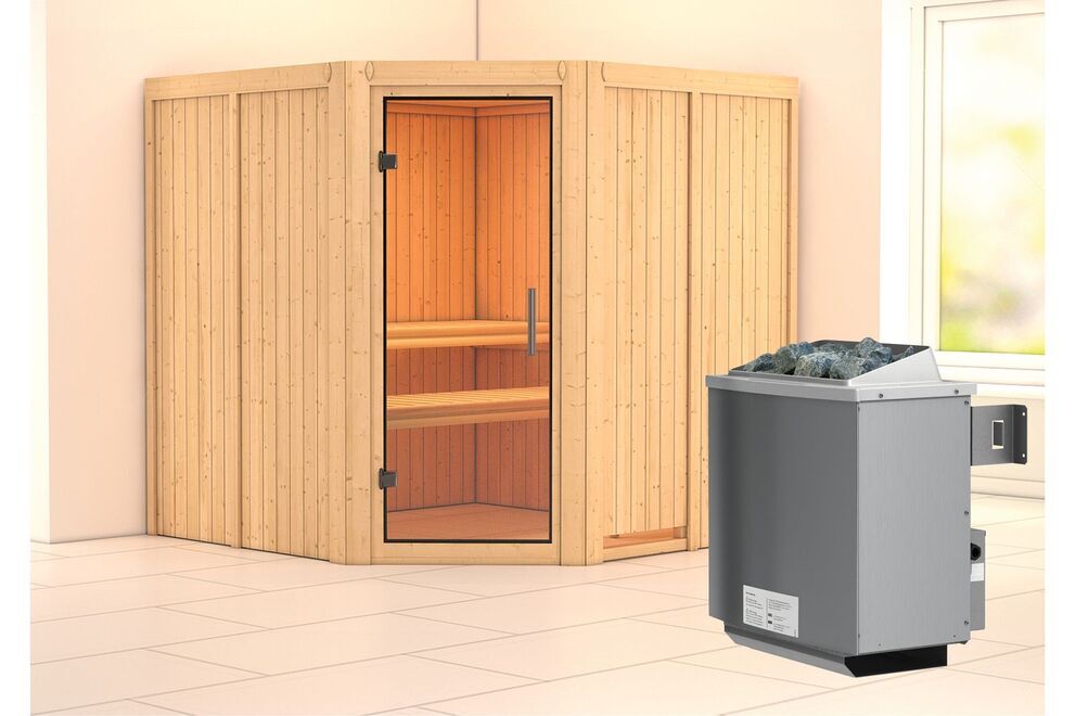 Außen befindet sich dann eine stabile Hartfaserplatte. Die Sauna verfügt über einen formschönen und praktischen Eckeinstieg. Mit ihren Außenmaßen von ca. 196 x 196 x 198 cm (mit Kranz ca. 210 x 210 x 202 cm) und den daraus resultierenden Innenmaßen von ca. 181 x 181 x 192 cm bietet diese Sauna für alle Anforderungen ausreichend Platz. Die zwei Liegen werden innen auf Vierkanthölzern montiert, welche aufgrund der Systembauweise in der Höhe nicht flexibel sind. Die untere Liege kann jedoch bei Bedarf platzsparend unter die obere Bank geschoben werden, sodass der Innenraum größer wirkt und sich die Reinigung einfacher gestaltet. Ein Ofenschutzgitter ist stets im Lieferumfang enthalten, ebenso wie drei Bänke und eine Kopfstütze, die das Interieur gekonnt abrunden.