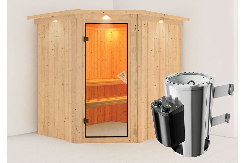 Außen befindet sich dann eine stabile Hartfaserplatte. Die Sauna verfügt über einen formschönen und praktischen Eckeinstieg. Mit ihren Außenmaßen von ca. 196 x 170 x 198 cm (mit Kranz ca. 210 x 184 x 202 cm) und den daraus resultierenden Innenmaßen von ca. 181 x 155 x 192 cm bietet diese Sauna für alle Anforderungen ausreichend Platz. Die zwei Liegen werden innen auf Vierkanthölzern montiert, welche aufgrund der Systembauweise in der Höhe nicht flexibel sind. Die untere Liege kann jedoch bei Bedarf platzsparend unter die obere Bank geschoben werden, sodass der Innenraum größer wirkt und sich die Reinigung einfacher gestaltet. Ein Ofenschutzgitter ist stets im Lieferumfang enthalten, ebenso wie zwei Bänke und eine Kopfstütze, die das Interieur gekonnt abrunden.
