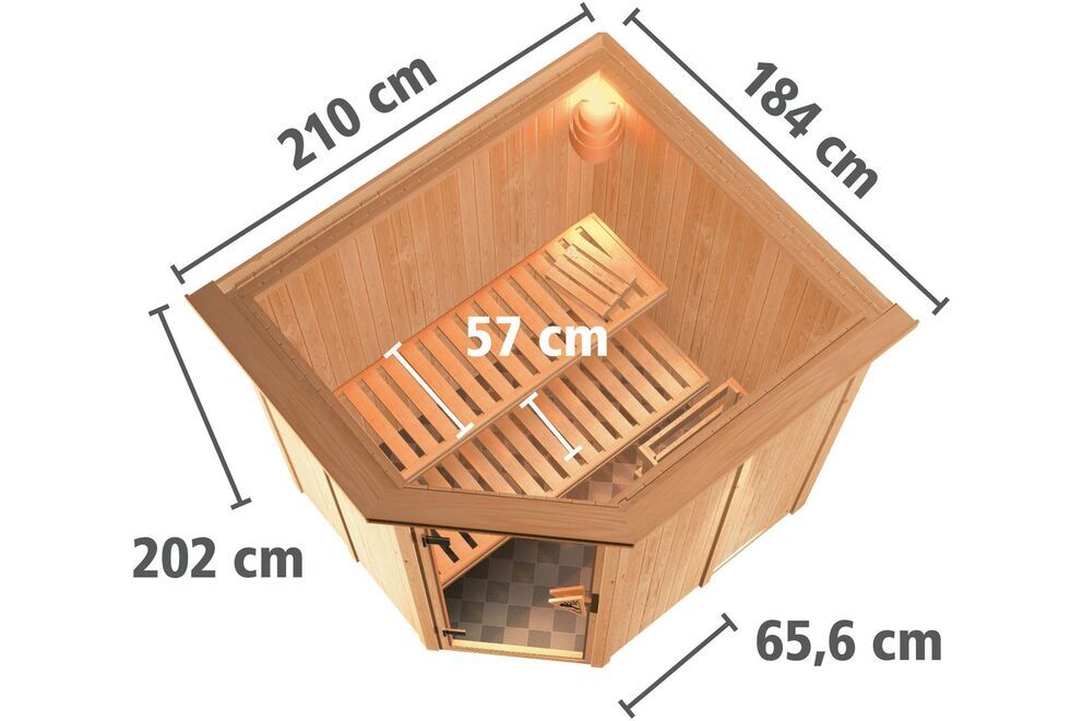 Außen befindet sich dann eine stabile Hartfaserplatte. Die Sauna verfügt über einen formschönen und praktischen Eckeinstieg. Mit ihren Außenmaßen von ca. 196 x 170 x 198 cm (mit Kranz ca. 210 x 184 x 202 cm) und den daraus resultierenden Innenmaßen von ca. 181 x 155 x 192 cm bietet diese Sauna für alle Anforderungen ausreichend Platz. Die zwei Liegen werden innen auf Vierkanthölzern montiert, welche aufgrund der Systembauweise in der Höhe nicht flexibel sind. Die untere Liege kann jedoch bei Bedarf platzsparend unter die obere Bank geschoben werden, sodass der Innenraum größer wirkt und sich die Reinigung einfacher gestaltet. Ein Ofenschutzgitter ist stets im Lieferumfang enthalten, ebenso wie zwei Bänke und eine Kopfstütze, die das Interieur gekonnt abrunden.