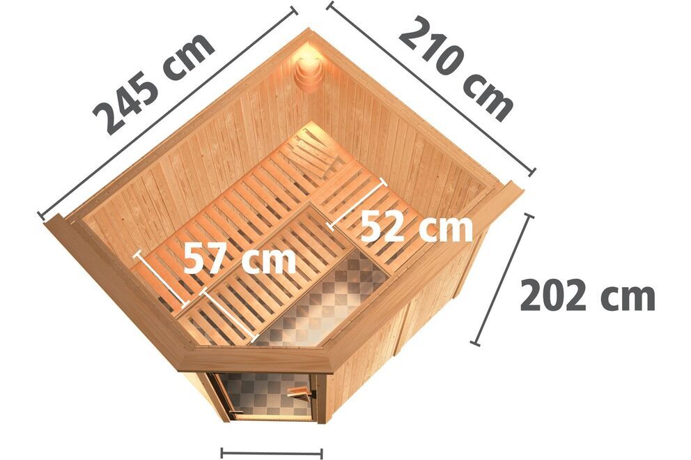 Außen befindet sich dann eine stabile Hartfaserplatte. Die Sauna verfügt über einen formschönen und praktischen Eckeinstieg. Mit ihren Außenmaßen von ca. 231 x 196 x 198 cm (mit Kranz ca. 245 x 210 x 202 cm) und den daraus resultierenden Innenmaßen von ca. 216 x 181 x 192 cm bietet diese Sauna für alle Anforderungen ausreichend Platz. Die zwei Liegen werden innen auf Vierkanthölzern montiert, welche aufgrund der Systembauweise in der Höhe nicht flexibel sind. Die untere Liege kann jedoch bei Bedarf platzsparend unter die obere Bank geschoben werden, sodass der Innenraum größer wirkt und sich die Reinigung einfacher gestaltet. Ein Ofenschutzgitter ist stets im Lieferumfang enthalten, ebenso wie drei Bänke und eine Kopfstütze, die das Interieur gekonnt abrunden.