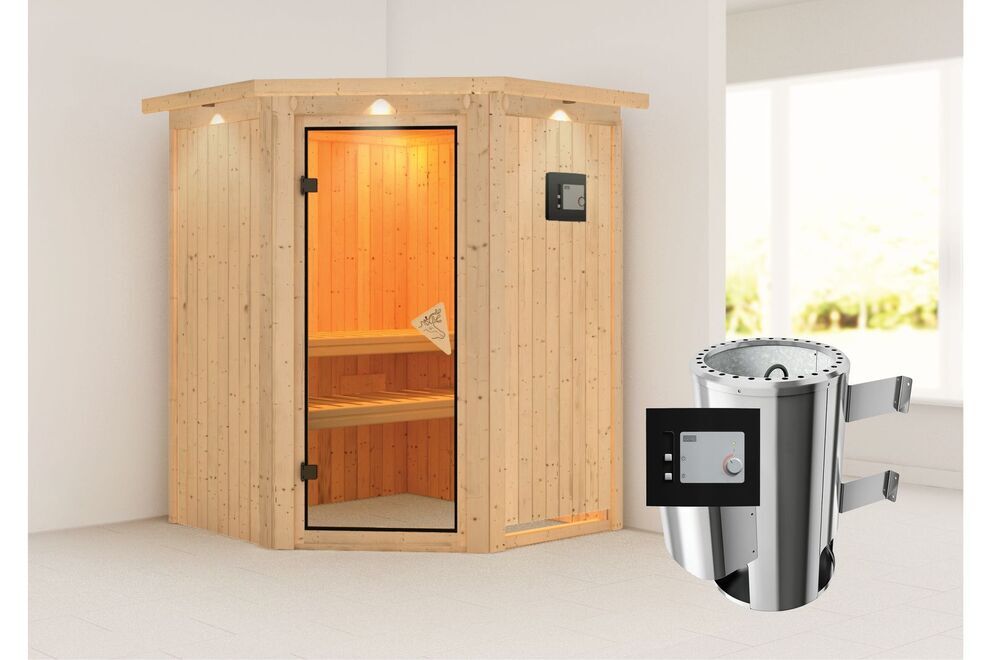 Außen befindet sich dann eine stabile Hartfaserplatte. Die Sauna verfügt über einen formschönen und praktischen Eckeinstieg. Mit ihren Außenmaßen von ca. 151 x 151 x 198 cm (mit Kranz ca. 165 x 165 x 202 cm) und den daraus resultierenden Innenmaßen von ca. 136 x 136 x 192 cm bietet diese Sauna für alle Anforderungen ausreichend Platz. Die zwei Liegen werden innen auf Vierkanthölzern montiert, welche aufgrund der Systembauweise in der Höhe nicht flexibel sind. Die untere Liege kann jedoch bei Bedarf platzsparend unter die obere Bank geschoben werden, sodass der Innenraum größer wirkt und sich die Reinigung einfacher gestaltet. Ein Ofenschutzgitter ist stets im Lieferumfang enthalten, ebenso wie zwei Bänke und eine Kopfstütze, die das Interieur gekonnt abrunden.