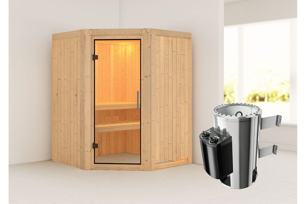 Außen befindet sich dann eine stabile Hartfaserplatte. Die Sauna verfügt über einen formschönen und praktischen Eckeinstieg. Mit ihren Außenmaßen von ca. 151 x 151 x 198 cm (mit Kranz ca. 165 x 165 x 202 cm) und den daraus resultierenden Innenmaßen von ca. 136 x 136 x 192 cm bietet diese Sauna für alle Anforderungen ausreichend Platz. Die zwei Liegen werden innen auf Vierkanthölzern montiert, welche aufgrund der Systembauweise in der Höhe nicht flexibel sind. Die untere Liege kann jedoch bei Bedarf platzsparend unter die obere Bank geschoben werden, sodass der Innenraum größer wirkt und sich die Reinigung einfacher gestaltet. Ein Ofenschutzgitter ist stets im Lieferumfang enthalten, ebenso wie zwei Bänke und eine Kopfstütze, die das Interieur gekonnt abrunden.