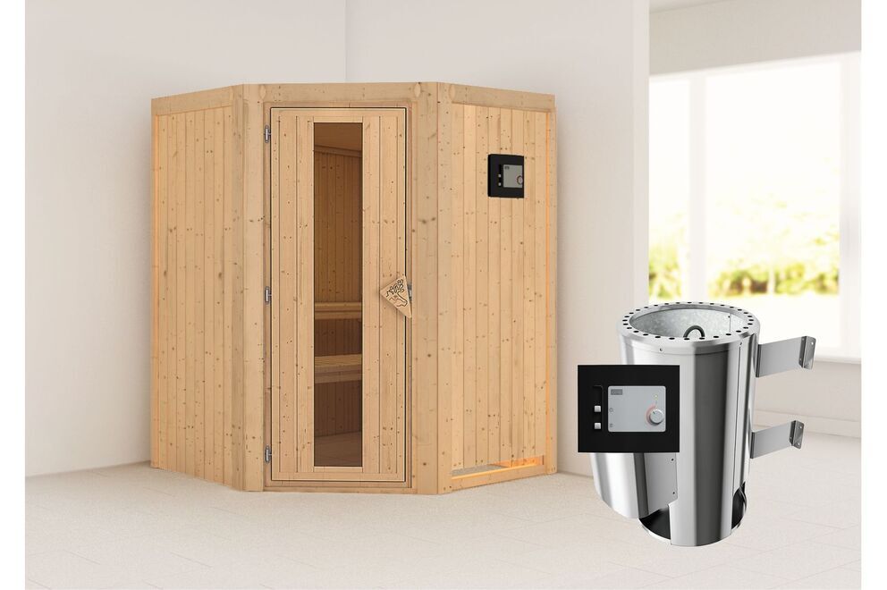 Außen befindet sich dann eine stabile Hartfaserplatte. Die Sauna verfügt über einen formschönen und praktischen Eckeinstieg. Mit ihren Außenmaßen von ca. 151 x 151 x 198 cm (mit Kranz ca. 165 x 165 x 202 cm) und den daraus resultierenden Innenmaßen von ca. 136 x 136 x 192 cm bietet diese Sauna für alle Anforderungen ausreichend Platz. Die zwei Liegen werden innen auf Vierkanthölzern montiert, welche aufgrund der Systembauweise in der Höhe nicht flexibel sind. Die untere Liege kann jedoch bei Bedarf platzsparend unter die obere Bank geschoben werden, sodass der Innenraum größer wirkt und sich die Reinigung einfacher gestaltet. Ein Ofenschutzgitter ist stets im Lieferumfang enthalten, ebenso wie zwei Bänke und eine Kopfstütze, die das Interieur gekonnt abrunden.