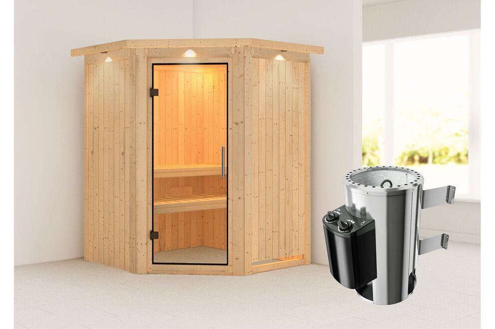 Außen befindet sich dann eine stabile Hartfaserplatte. Die Sauna verfügt über einen formschönen und praktischen Eckeinstieg. Mit ihren Außenmaßen von ca. 151 x 151 x 198 cm (mit Kranz ca. 165 x 165 x 202 cm) und den daraus resultierenden Innenmaßen von ca. 136 x 136 x 192 cm bietet diese Sauna für alle Anforderungen ausreichend Platz. Die zwei Liegen werden innen auf Vierkanthölzern montiert, welche aufgrund der Systembauweise in der Höhe nicht flexibel sind. Die untere Liege kann jedoch bei Bedarf platzsparend unter die obere Bank geschoben werden, sodass der Innenraum größer wirkt und sich die Reinigung einfacher gestaltet. Ein Ofenschutzgitter ist stets im Lieferumfang enthalten, ebenso wie zwei Bänke und eine Kopfstütze, die das Interieur gekonnt abrunden.