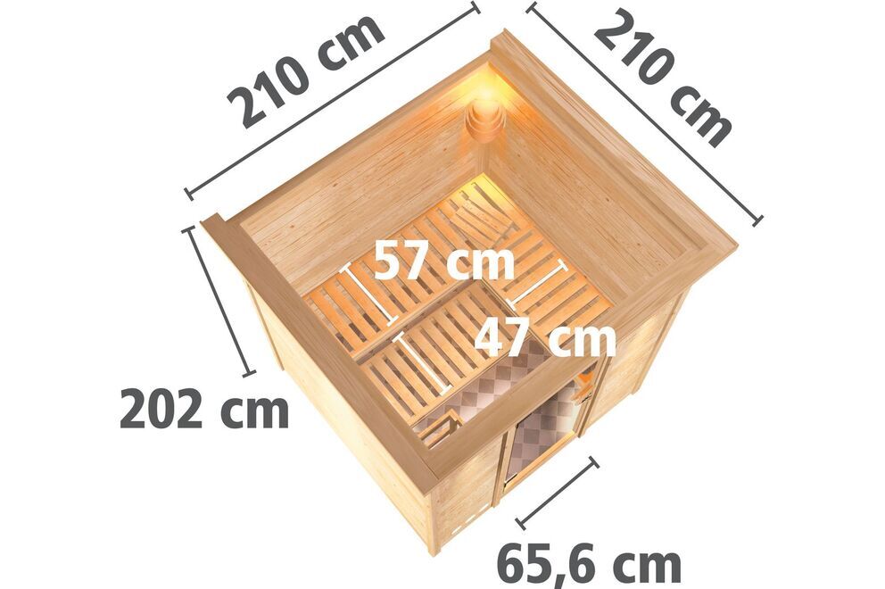 Außen befindet sich dann eine stabile Hartfaserplatte. Die Sauna verfügt über einen formschönen und praktischen Fronteinstieg. Mit ihren Außenmaßen von ca. 196 x 196 x 198 cm (mit Kranz ca. 210 x 210 x 202 cm) und den daraus resultierenden Innenmaßen von ca. 181 x 181 x 192 cm bietet diese Sauna für alle Anforderungen ausreichend Platz. Die zwei Liegen werden innen auf Vierkanthölzern montiert, welche aufgrund der Systembauweise in der Höhe nicht flexibel sind. Die untere Liege kann jedoch bei Bedarf platzsparend unter die obere Bank geschoben werden, sodass der Innenraum größer wirkt und sich die Reinigung einfacher gestaltet. Ein Ofenschutzgitter ist stets im Lieferumfang enthalten, ebenso wie drei Bänke und eine Kopfstütze, die das Interieur gekonnt abrunden.