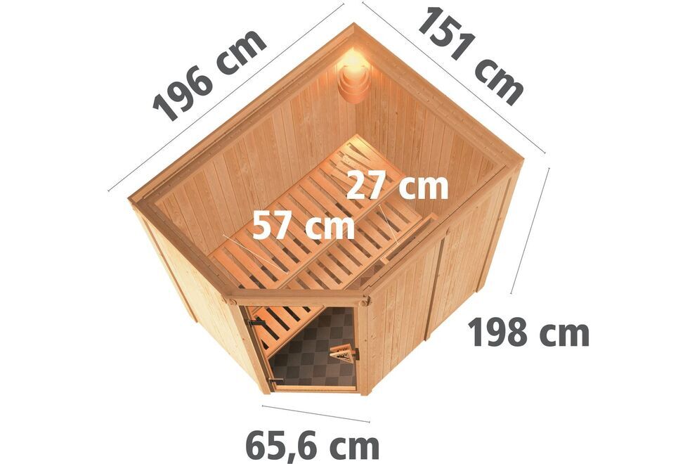 Außen befindet sich dann eine stabile Hartfaserplatte. Die Sauna verfügt über einen formschönen und praktischen Eckeinstieg. Mit ihren Außenmaßen von ca. 151 x 196 x 198 cm (mit Kranz ca. 165 x 210 x 202 cm) und den daraus resultierenden Innenmaßen von ca. 136 x 181 x 192 cm bietet diese Sauna für alle Anforderungen ausreichend Platz. Die zwei Liegen werden innen auf Vierkanthölzern montiert, welche aufgrund der Systembauweise in der Höhe nicht flexibel sind. Die untere Liege kann jedoch bei Bedarf platzsparend unter die obere Bank geschoben werden, sodass der Innenraum größer wirkt und sich die Reinigung einfacher gestaltet. Ein Ofenschutzgitter ist stets im Lieferumfang enthalten, ebenso wie zwei Bänke und eine Kopfstütze, die das Interieur gekonnt abrunden.