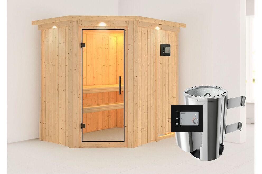 Außen befindet sich dann eine stabile Hartfaserplatte. Die Sauna verfügt über einen formschönen und praktischen Eckeinstieg. Mit ihren Außenmaßen von ca. 151 x 196 x 198 cm (mit Kranz ca. 165 x 210 x 202 cm) und den daraus resultierenden Innenmaßen von ca. 136 x 181 x 192 cm bietet diese Sauna für alle Anforderungen ausreichend Platz. Die zwei Liegen werden innen auf Vierkanthölzern montiert, welche aufgrund der Systembauweise in der Höhe nicht flexibel sind. Die untere Liege kann jedoch bei Bedarf platzsparend unter die obere Bank geschoben werden, sodass der Innenraum größer wirkt und sich die Reinigung einfacher gestaltet. Ein Ofenschutzgitter ist stets im Lieferumfang enthalten, ebenso wie zwei Bänke und eine Kopfstütze, die das Interieur gekonnt abrunden.