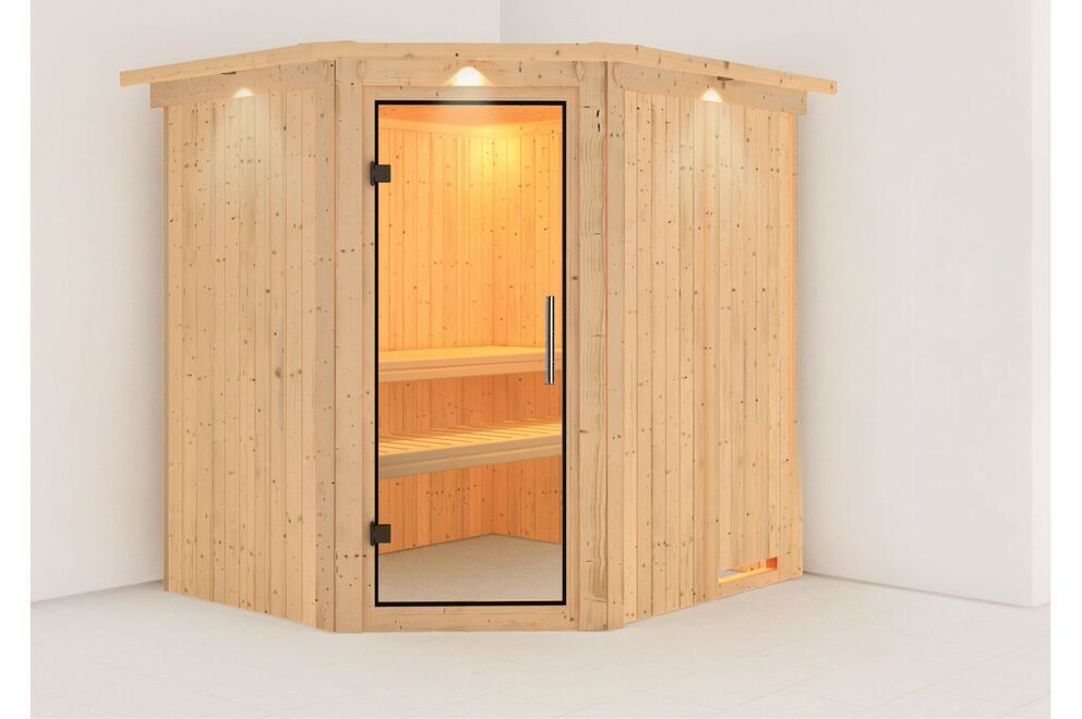 Außen befindet sich dann eine stabile Hartfaserplatte. Die Sauna verfügt über einen formschönen und praktischen Eckeinstieg. Mit ihren Außenmaßen von ca. 196 x 170 x 198 cm (mit Kranz ca. 210 x 184 x 202 cm) und den daraus resultierenden Innenmaßen von ca. 181 x 155 x 192 cm bietet diese Sauna für alle Anforderungen ausreichend Platz. Die zwei Liegen werden innen auf Vierkanthölzern montiert, welche aufgrund der Systembauweise in der Höhe nicht flexibel sind. Die untere Liege kann jedoch bei Bedarf platzsparend unter die obere Bank geschoben werden, sodass der Innenraum größer wirkt und sich die Reinigung einfacher gestaltet. Ein Ofenschutzgitter ist stets im Lieferumfang enthalten, ebenso wie zwei Bänke und eine Kopfstütze, die das Interieur gekonnt abrunden.