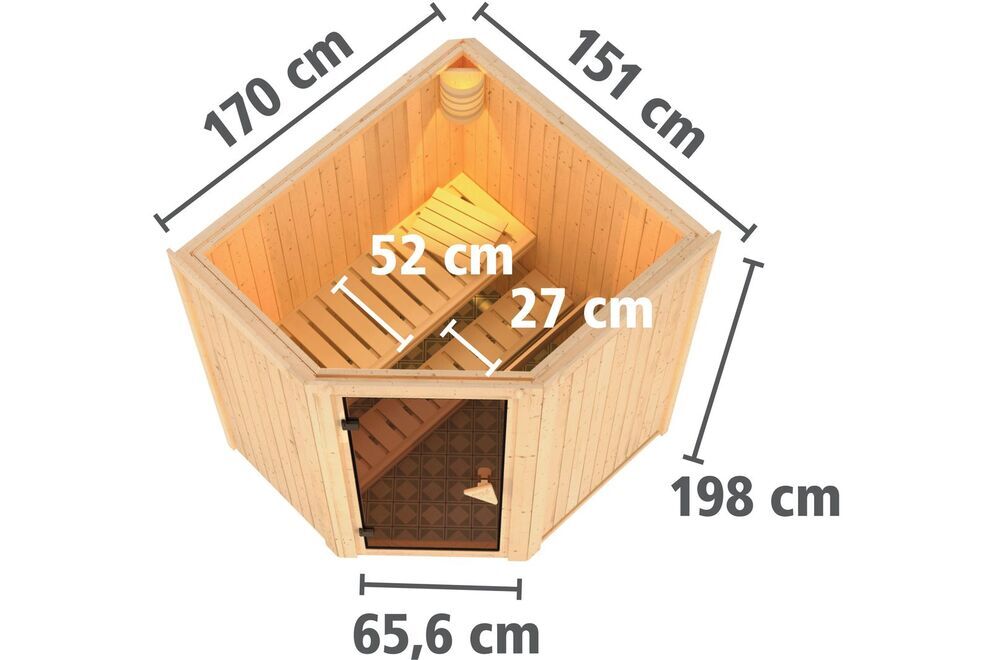 Außen befindet sich dann eine stabile Hartfaserplatte. Die Sauna verfügt über einen formschönen und praktischen Eckeinstieg. Mit ihren Außenmaßen von ca. 170 x 151 x 198 cm (mit Kranz ca. 184 x 165 x 202 cm) und den daraus resultierenden Innenmaßen von ca. 155 x 136 x 192 cm bietet diese Sauna für alle Anforderungen ausreichend Platz. Die zwei Liegen werden innen auf Vierkanthölzern montiert, welche aufgrund der Systembauweise in der Höhe nicht flexibel sind. Die untere Liege kann jedoch bei Bedarf platzsparend unter die obere Bank geschoben werden, sodass der Innenraum größer wirkt und sich die Reinigung einfacher gestaltet. Ein Ofenschutzgitter ist stets im Lieferumfang enthalten, ebenso wie zwei Bänke und eine Kopfstütze, die das Interieur gekonnt abrunden.