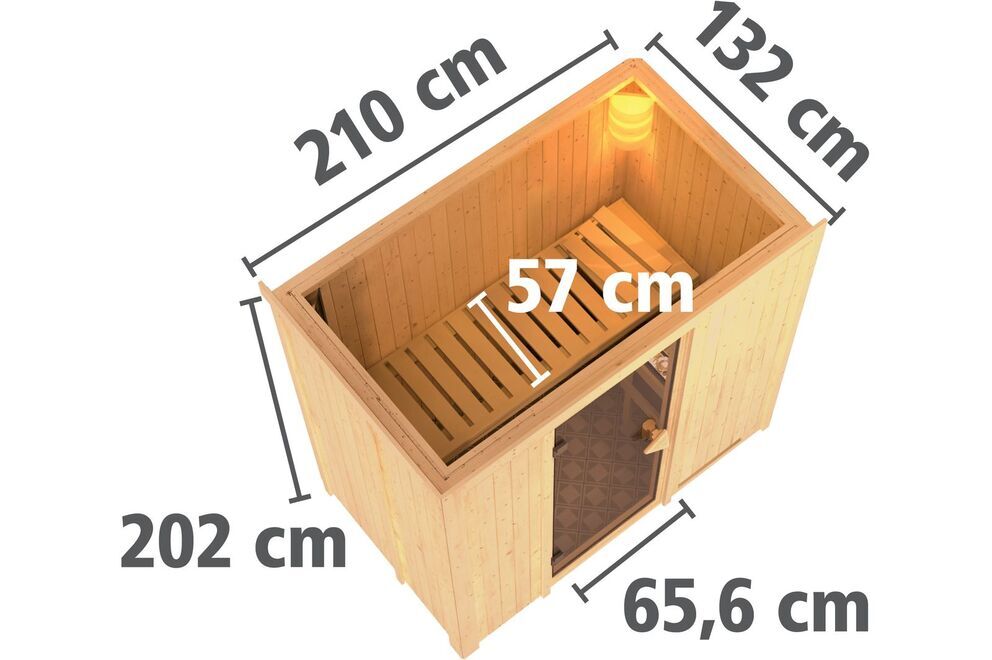 Außen befindet sich dann eine stabile Hartfaserplatte. Die Sauna verfügt über einen formschönen und praktischen Fronteinstieg. Mit ihren Außenmaßen von ca. 196 x 118 x 198 cm (mit Kranz ca. 210 x 132 x 202 cm) und den daraus resultierenden Innenmaßen von ca. 181 x 103 x 192 cm bietet diese Sauna für alle Anforderungen ausreichend Platz. Die zwei Liegen werden innen auf Vierkanthölzern montiert, welche aufgrund der Systembauweise in der Höhe nicht flexibel sind. Die untere Liege kann jedoch bei Bedarf platzsparend unter die obere Bank geschoben werden, sodass der Innenraum größer wirkt und sich die Reinigung einfacher gestaltet. Ein Ofenschutzgitter ist stets im Lieferumfang enthalten, ebenso wie einer Bank und eine Kopfstütze, die das Interieur gekonnt abrunden.