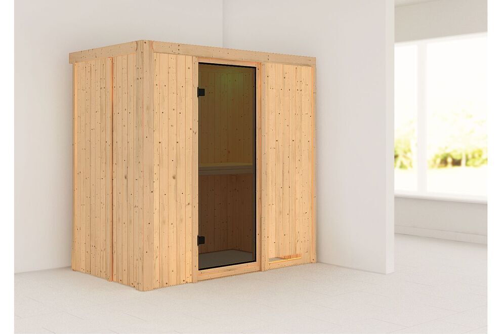 Die Systembausauna Variado von KARIBU aus ca. 68 mm starken Wandelementen bietet Ihnen ein optimales Preis-Leistungsverhältnis bei gleichzeitig idealen Dämmwerten. Das Modell verfügt über eine Grundfläche von ca. 2,4 m² und einem umbauten Raum von ca. 3,5 m³. Durch die Bauweise aus vorgefertigten Wandelementen ist die Sauna sehr schnell montiert. Die Wandelemente bestehen aus einer Rahmenkonstruktion aus ca. 42 mm starken Vierkanthölzern, in die eine hochwertige Mineralwolldämmung eingebracht wird. Dieser Dämmstoff wird dann mit hochwertigem Softline-Profilholz aus bester nordischer Fichte verkleidet und lässt somit nicht erahnen, welche Qualitäten unter der Holzverkleidung schlummern. Im Unterschied zu den 38 mm bzw. 40 mm Vollholz-Saunen von KARIBU, sind bei dieser 68 mm-Sauna die Rückseiten keine Sichtseiten. Diese sind, genau wie die Deckenelemente, nur auf der Innenseite mit dem Profilholz verkleidet.
