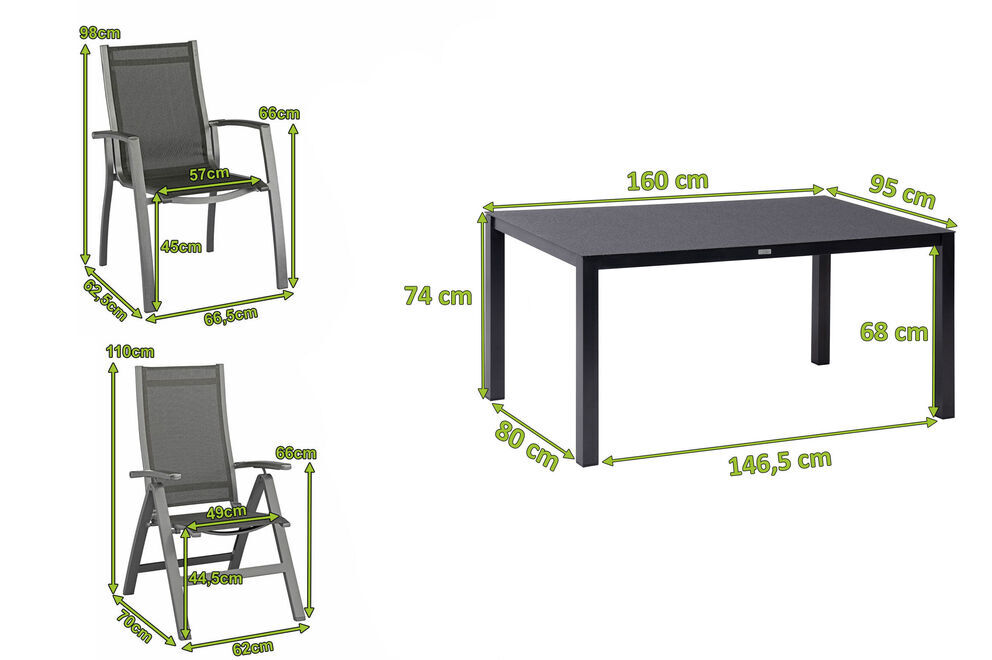 Bei dieser Esstischgruppe treffen hochwertige Materialien und Design auf modernste Weise aufeinander. Das Set besteht aus einem innovativen Ausziehtisch der Marke OUTFLEXX mit den Maßen von ca. 160x95x74 cm, 4 Stapelsessel und 2 Klappstühlen der Marke Kettler aus der Serie 'Altura'.