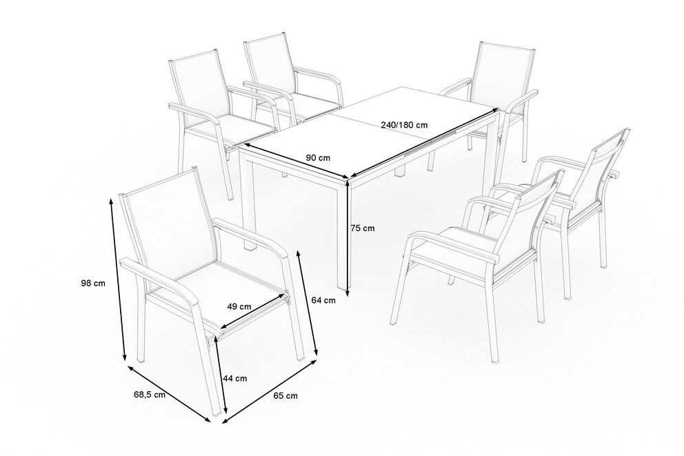 Das Zusammenspiel aus hochwertigen Materialien und zeitlosem Design ist maßgeblich kennzeichnend für dieses Gartenmöbel-Set aus dem Hause Kettler/Siena Garden. Das Set für 6 Personen besteht aus dem Ausziehtisch 'Miros' von Siena Garden mit den Maßen von ca. 180/240 x 90 cm und 6 Stapelsesseln aus der 'Basic Plus' Serie von Kettler.