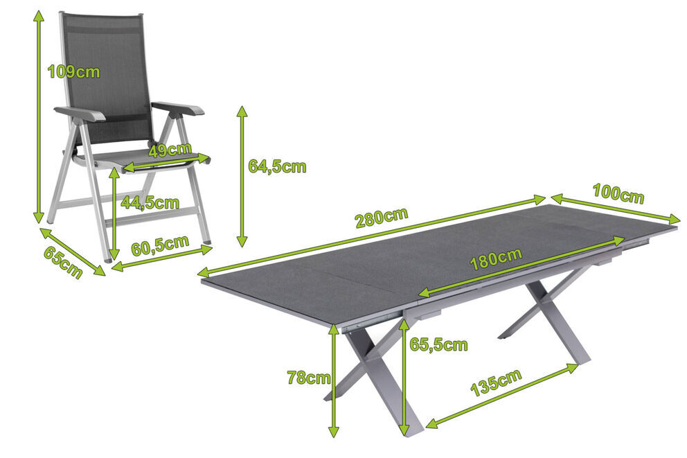 Das stylische Set besteht aus einem innovativen Ausziehtisch von OUTFLEXX® und 6 Klappstühlen der Serie BasicPlus von KETTLER. Der elegante Esstisch ist nicht nur optisch ein Schmuckstück, er unterstützt Sie auch bei der Bewirtung von Familie und Freunden. Sie können seine ca. 180 cm lange Tischplatte mithilfe des automatischen Schubladenauszuges ganz leicht um ca. 50 oder 100 cm auf maximal ca. 280 cm vergrößern. Ideal also für 6-10 Personen – und das nächste Gartenfest. Dazu ziehen Sie einfach an einer der beiden Verlängerungsplatten, die sich jeweils unter einem Tischende befindet. Jede Platte lässt sich so leichtgängig wie eine Schublade einzeln ausfahren und wird anschließend automatisch in der richtigen Höhe an die Tischplatte gedrückt. Fertig! Bei Bedarf ziehen Sie auch noch die andere Seite aus. Und wenn Ihre Tafel bereits gedeckt ist? Kein Problem, die Tischplatte lässt sich ebenso leicht gedeckt vergrößern und genauso mühelos auch wieder verkleinern. Gönnen Sie sich diesen praktischen Luxus für Ihren Diningbereich, der sich auch visuell in Ihr Gartendesign integriert. Seine besondere Optik verdankt der Tisch der graufarbenen Tischplatte aus Sicherheitsglas mit Spraystone Finish, die perfekt mit dem modernen X-Gestell in Silber harmoniert. Das hochwertige Aluminiumgestell ist so hergestellt worden, dass es zu allen KETTLER Artikeln in der Farbe “silber” kombiniert werden kann. Bei einem Gewicht von ca. 59,25 kg ist der ca. 180/280 x 100 x 78 cm große Tisch zudem äußerst stabil.