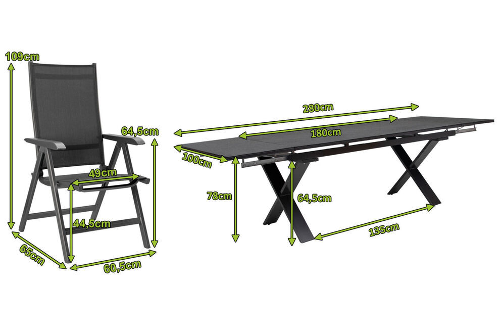 Das stylische Set besteht aus einem innovativen Ausziehtisch von OUTFLEXX® und 6 Klappstühlen der Serie BasicPlus von KETTLER. Der elegante Esstisch ist nicht nur optisch ein Schmuckstück, er unterstützt Sie auch bei der Bewirtung von Familie und Freunden. Sie können seine ca. 180 cm lange Tischplatte mithilfe des automatischen Schubladenauszuges ganz leicht um ca. 50 oder 100 cm auf maximal ca. 280 cm vergrößern. Ideal also für 6-10 Personen – und das nächste Grillfest. Dazu ziehen Sie einfach an einer der beiden Verlängerungsplatten, die sich jeweils unter einem Tischende befindet. Jede Platte lässt sich so leichtgängig wie eine Schublade einzeln ausfahren und wird anschließend automatisch in der richtigen Höhe an die Tischplatte gedrückt. Fertig! Bei Bedarf ziehen Sie auch noch die andere Seite aus. Und wenn Ihre Tafel bereits gedeckt ist? Kein Problem, die Tischplatte lässt sich ebenso leicht gedeckt vergrößern und genauso mühelos auch wieder verkleinern. Sein Gewicht von ca. 59,25 kg verleiht dem ca. 180/280 x 100 x 78 cm großen Tisch zudem überragene Stabilität und Standhaftigkeit. Gönnen Sie sich diesen praktischen Luxus für Ihren Diningbereich, der sich auch visuell in Ihr Gartendesign integriert. Seine besondere Optik verdankt der Tisch der schwarzfarbenen Tischplatte aus Sicherheitsglas mit Spraystone Finish, die perfekt mit dem modernen X-Gestell in Anthrazit harmoniert. Das hochwertige Aluminiumgestell ist so hergestellt worden, dass Sie das Set auch mit allen KETTLER Artikeln in der Farbe “anthrazit” ergänzen können.