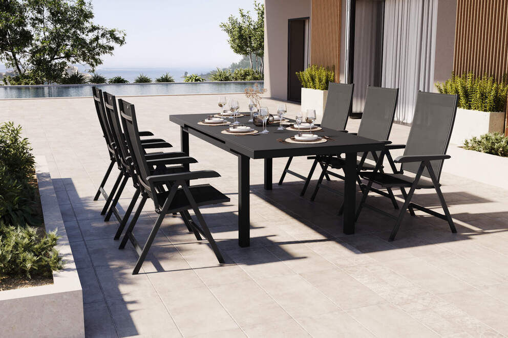 Bei dieser Esstischgruppe treffen hochwertige Materialien und Design auf modernste Weise aufeinander. Das Set besteht aus einem innovativen Premium Ausziehtisch der Marke OUTFLEXX mit den Maßen von ca. 180/240 x 100 x 76 cm und 6 Klappstühlen der Marke Kettler aus der Serie 'BasicPlus'.
