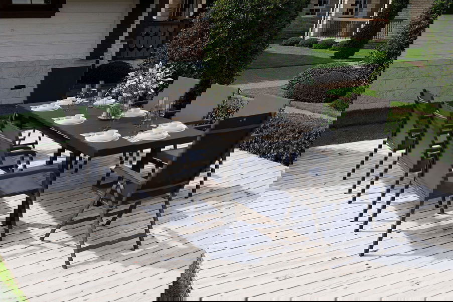 Bei dieser Esstischgruppe treffen hochwertige Materialien und Design auf modernste Weise aufeinander. Das Set besteht aus einem innovativen Premium Ausziehtisch der Marke OUTFLEXX mit den Maßen von ca. 180/240 x 100 x 76 cm, 6 Stapel- und 2 Klappstühlen der Marke Kettler aus der Serie 'BasicPlus'.