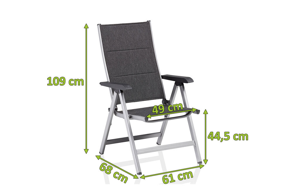 Mit dem Multipositionssessel aus der BasicPlus Padded Serie bequem durch den Sommer. Mittels Rasterschiene lässt sich der Sessel leicht in 4 verschiedene Positionen bringen - so wird der Komfort eines Liegestuhls direkt integriert. Das solide und formschöne Gestell besteht aus edlem, silberfarbenem Aluminium. Das witterungsbeständige Material ist durch seine Flexibilität und seine zusätzliche Polsterung (padded) auch ohne Auflagen sehr bequem. Das formstabile, anthrazite Gewebe nimmt kein Wasser auf, ist atmungsaktiv, UV-Beständig und trocknet nach einem kurzen Schauer sehr schnell - insgesamt also der perfekte Begleiter in Ihrem Garten. Dank der leichten Materialien und des Klappmechanismus lässt sich der Stuhl leicht zu handhaben - wenn er nicht benötigt wird können Sie ihn platzsparend verstauen.