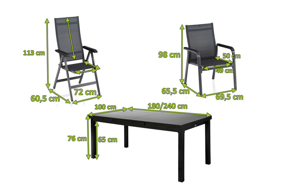 Sowohl die Stapelsessel mit Maßen von jeweils ca. 69,5 x 69,5 x 98 cm als auch die Klappstühle mit Maßen von jeweils ca. 72 x 60,5 x 113 cm sind mit einem hochwertigen Outdoor-Gewebe in der Farbe Lakritz bezogen, welches dank des integrierten Polyesterfadens im Textilen ein stoffartiges Hautgefühl bietet. Das luftig, leichte Material eignet sich optimal für den Einsatz im Freien, da es wasserabweisend und schnell trocknend, witterungs- und UV-beständig ist. Es bleicht selbst bei starker Sonneneinstrahlung nicht aus. Es hält anspruchsvollen Witterungsbedingungen stand und ist unempfindlich gegen Temperaturschwankungen. Außerdem ist es resistent gegen Schimmelbefall. Durch das geringe Gewicht beider Sessel sind diese flexibel verstellbar. Als Plus an Komfort besitzt der Klappstühle eine 4-fach verstellbare Rückenlehne - so können Sie es sich richtig bequem machen! Dazu sind beide Sessel platzsparend verstaubar - der Klappstühle indem Sie ihn zusammenklappen, der Stapelsessel wird aufeinander gesteckt.