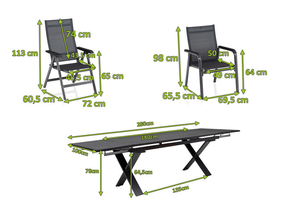 Diese Esstischgarnitur besteht aus einem Outflexx Auszieh-Esstisch, sechs Stapelsesseln und zwei Klappstühlen der Serie Basic Plus Premium. Diese Sitzgruppe ist die perfekte Wahl für alle, die ein langlebiges und pflegeleichtes Outdoor-Set suchen.
