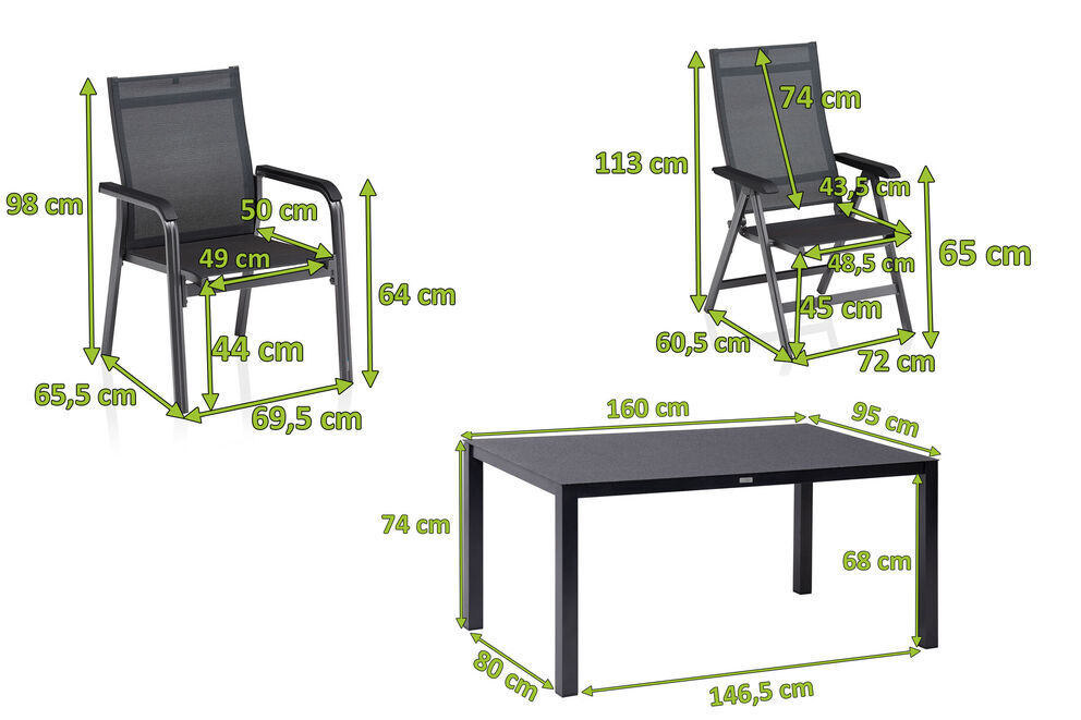 Sowohl die Stapelsessel mit Maßen von jeweils ca. 69,5 x 65,5 x 98 cm als auch die Klappstühle mit Maßen von jeweils ca. 72 x 60,5 x 113 cm sind mit einem hochwertigen Outdoor-Gewebe in der Farbe Lakritz bezogen, welches dank des integrierten Polyesterfadens im Textilen ein stoffartiges Hautgefühl bietet. Das luftig, leichte Material eignet sich optimal für den Einsatz im Freien, da es wasserabweisend und schnell trocknend, witterungs- und UV-beständig ist. Es bleicht selbst bei starker Sonneneinstrahlung nicht aus. Es hält anspruchsvollen Witterungsbedingungen stand und ist unempfindlich gegen Temperaturschwankungen. Außerdem ist es resistent gegen Schimmelbefall. Durch das geringe Gewicht beider Sessel sind diese flexibel verstellbar. Als Plus an Komfort besitzt der Klappstühle eine 4-fach verstellbare Rückenlehne - so können Sie es sich richtig bequem machen! Dazu sind beide Sessel platzsparend verstaubar - der Klappstühle indem Sie ihn zusammenklappen, der Stapelsessel wird aufeinander gesteckt.