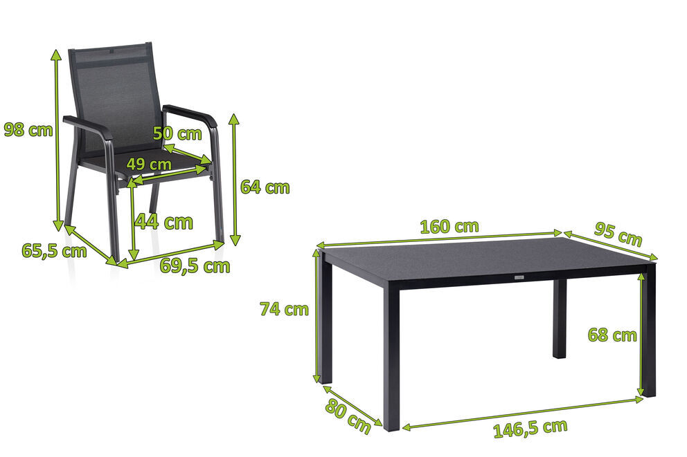 Der Tisch und die Stühle sind aus robustem Aluminium gefertigt, das nicht nur leicht und pflegeleicht ist, sondern auch langlebig und wetterfest. Die Basic Plus Premium Stapelsessel mit den Maßen von jeweils ca. 69,5 x 65,5 x 98 cm sind die perfekten Begleiter, lassen sich einfach verstellen und sind stets flexibel. Dank des geringen Eigengewichts von ca. 4,6 kg lässt sich der Stuhl flexibel bewegen. Wird ein Sessel einmal nicht benötigt kann dieser gestapelt und platzsparend verstaut werden. Die Basic Plus Premium Serie ist mit einem hochwertigen Outdoor-Gewebe in der Farbe Lakritz bezogen, welches dank des integrierten Polyesterfadens im Textilen ein stoffartiges Hautgefühl bietet. Das luftig, leichte Material eignet sich optimal für den Einsatz im Freien, da es wasserabweisend und schnell trocknend, witterungs- und UV-beständig ist. Es bleicht selbst bei starker Sonneneinstrahlung nicht aus. Es hält anspruchsvollen Witterungsbedingungen stand und ist unempfindlich gegen Temperaturschwankungen. Außerdem ist es resistent gegen Schimmelbefall.
