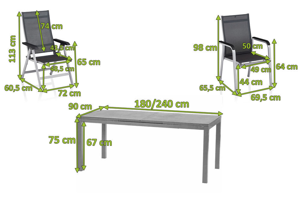 Sowohl die Stapelsessel mit Maßen von jeweils ca. 69,5 x 65,5 x 98 cm als auch die Klappstuhl mit Maßen von jeweils ca. 72 x 60,5 x 113 cm sind mit einem hochwertigen Outdoor-Gewebe in der Farbe Lakritz bezogen, welches dank des integrierten Polyesterfadens im Textilen ein stoffartiges Hautgefühl bietet. Das luftig, leichte Material eignet sich optimal für den Einsatz im Freien, da es wasserabweisend und schnell trocknend, witterungs- und UV-beständig ist. Es bleicht selbst bei starker Sonneneinstrahlung nicht aus. Es hält anspruchsvollen Witterungsbedingungen stand und ist unempfindlich gegen Temperaturschwankungen. Außerdem ist es resistent gegen Schimmelbefall. Durch das geringe Gewicht beider Sessel sind diese flexibel verstellbar. Als Plus an Komfort besitzt der Klappstuhl eine 4-fach verstellbare Rückenlehne - so können Sie es sich richtig bequem machen! Dazu sind beide Sessel platzsparend verstaubar - der Klappstuhl indem Sie ihn zusammenklappen, der Stapelsessel wird aufeinander gesteckt.