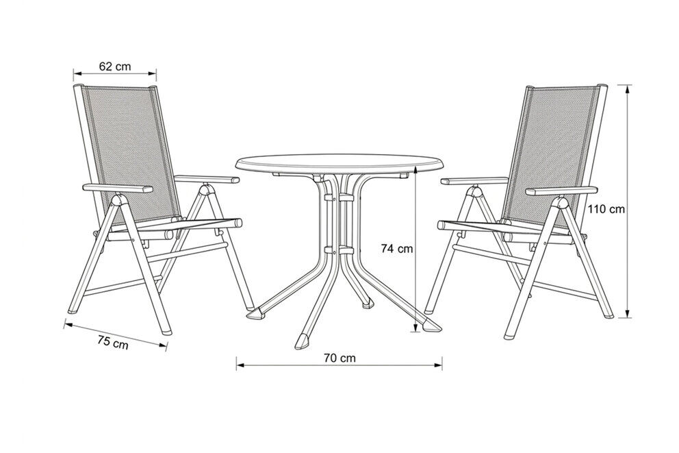 Das Aluminiumgestell sorgt für ein geringes Eigengewicht von jeweils ca. 6 kg, während die Textilene-Bespannung eine angenehme Sitzfläche und Rückenpartie bietet. Die Rückenlehne ist ergonomisch geformt und mehrfach verstellbar, sodass Sie Ihre Sitzposition bequem anpassen können – ob aufrecht beim Essen oder entspannt zurückgelehnt beim Lesen und Genießen. Mit einer Gesamtgröße von ca. 75 x 62 x 110 cm bieten die Stühle ein komfortables Sitzgefühl. Die Sitzhöhe liegt bei ca. 47 cm, die innere Sitzbreite bei ca. 51 cm, die Höhe der Rückenlehne bei ca. 72 cm und die Armlehnenhöhe bei ca. 67 cm.