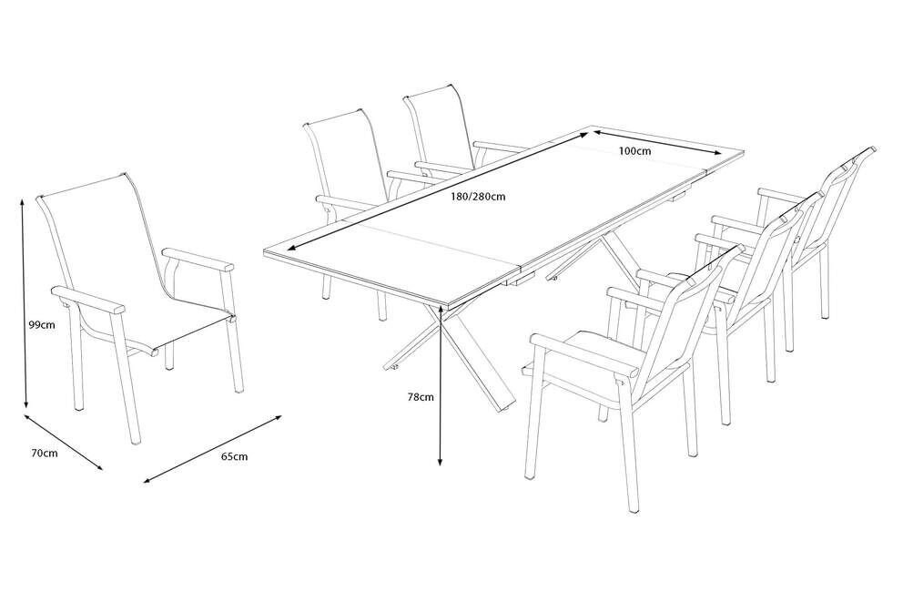 Der Ausziehtisch verfügt über eine Tischhöhe von ca. 78 cm, eine Tischplattenstärke von ca. 0,5 cm und einen Beinabstand von ca. 135 cm in der Länge – ideal, um auch mehrere Stühle komfortabel zu platzieren. Unter der Tischkante stehen ca. 64,5 cm Beinfreiheit zur Verfügung. Die attraktiven Stapelsessel besitzen eine Gesamthöhe von ca. 99 cm, eine Sitzhöhe von ca. 47 cm und eine bequeme Sitztiefe von ca. 47 cm. Mit einem Gewicht von lediglich ca. 3,75 kg pro Stuhl lassen sie sich besonders einfach handhaben.