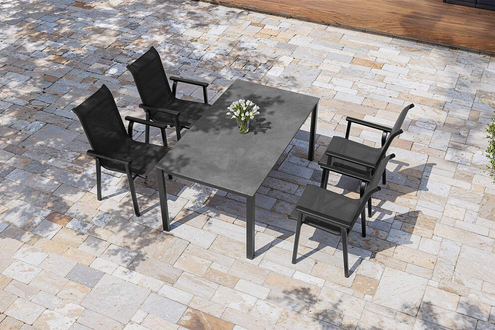 Im Mittelpunkt steht der elegante Esstisch, dessen Tischplatte aus widerstandsfähigem Kettalit in edler anthrazitfarbener Steinoptik beeindruckt. Das Material ist bruchsicher, hitzebeständig, schlagfest und selbstverständlich witterungsbeständig – perfekt für den täglichen Einsatz im Außenbereich. Die pflegeleichte Oberfläche ist leicht zu reinigen und behält auch bei intensiver Nutzung ihre hochwertige Struktur. Das pulverbeschichtete Aluminiumgestell verleiht dem Tisch zusätzliche Stabilität und schützt es zuverlässig vor Korrosion. Mit Maßen von ca. 160 x 90 x 74 cm (L x B x H) bietet der Tisch großzügigen Platz für ca. 4–6 Personen, während die Unterschubhöhe von ca. 71 cm für angenehme Beinfreiheit sorgt.
